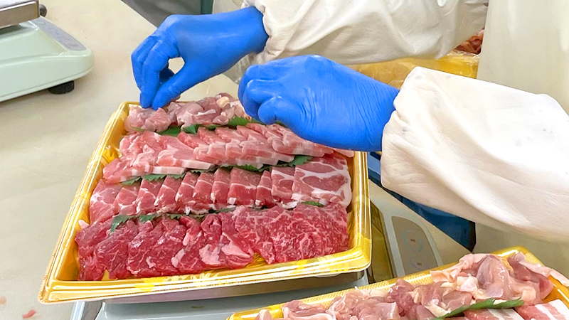焼き肉用のお肉などを決められたサイズや暑さにカットし、パックトレーに盛りつけます。