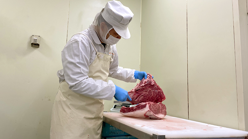 部位ごとに分かれた部分肉を加工します。骨や筋を肉から外し、後工程のチームが作業しやすいサイズに切り分けます。切り分け作業は業務に慣れた社員が行います。