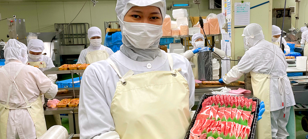 焼き肉用のお肉などを決められたサイズや暑さにカットし、パックトレーに盛りつけます。